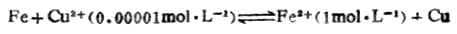 1,表明Cu2+是比Fe2+更强的氧化剂,Fe是比Cu更强的还原剂所以上述反应可自发地向右进行。