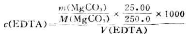 称取在110℃烘干过的基准物质MgCO30.21g(准至0.1mg),置于烧杯中,用稀盐酸溶解后配成250ml溶液,吸取25.00ml于锥形瓶中,加浓氨水至溶液呈碱性,再加5mlPH约为10的NH+-NH3·H2o 缓冲溶液,加铬黑T指示剂,用EDTA标准溶液滴定至溶液呈蓝色.