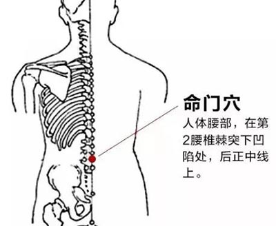 取穴法:在盆骨外侧摸到最高点,为“髂棘”;髂棘连线与身体后正中线的交点约平第4腰椎棘突。然后往上循摸第2个明显的骨性凸起,为第2腰椎棘突。该棘突下即为命门穴。