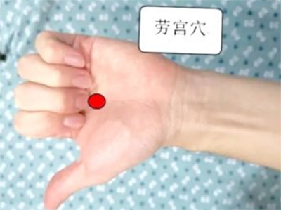 劳宫穴:在手掌心,当第2、3掌骨之间偏于第3掌骨,握拳屈指时,位于中指和无名指指尖处。取劳宫穴治疗可清心热、泻肝火。