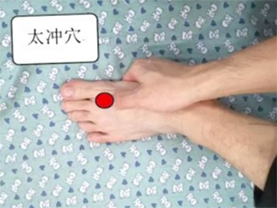 太冲穴:位于足背侧,第一、二跖骨结合部之前凹陷处。太冲是肝经的原穴。中医认为,肝为“将军之官”,主怒。人生气之时,肝也会受到影响,通过刺激太冲穴,可以达到疏肝解郁、泻火的功效。