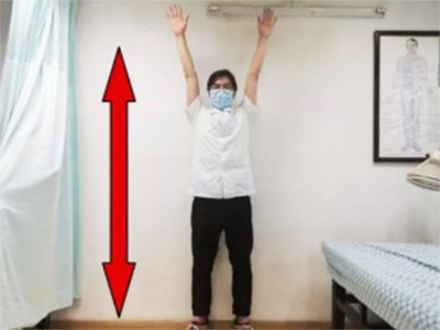 贴墙站立,两足平开,与肩同宽,含胸收腹,腰脊放松。两臂平举自体侧缓缓抬起至头顶上方转掌心朝上,向上作托举。顺势将两脚跟向上提起,稍作停顿,将两脚跟下落着地,足跟亦随双手的托举而起落。
