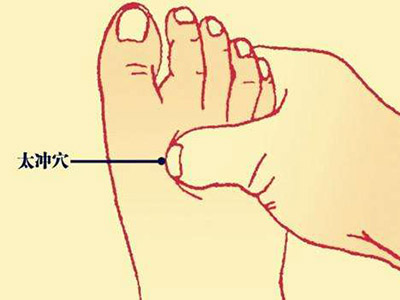 太冲穴位于足背侧,第一、二趾骨的骨缝之间,向后约3横指宽处有一个凹陷中。用指端压迫此处,会感到脉动。生气后,在双侧此穴位上用拇指指端用力按揉,可以让上升的肝气往下疏泄,这时这个穴位会很痛,必需反复按摩,直到这个穴位不再疼痛为止。