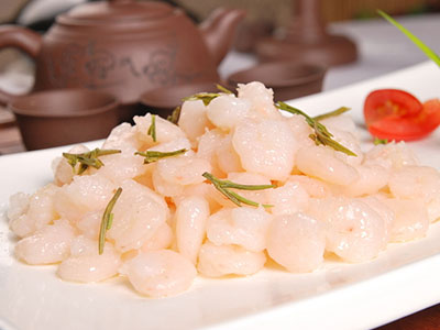 白袍虾仁 主料虾仁以河虾为佳,味甘,性微温,有补肾壮阳、通乳托毒的功效。将甘、凉的鸡蛋清和盐与淀粉制成一袭精美的战袍,包裹起脱皮去壳的白胖胖的虾仁,投入武火高温快速翻炒后口感就变得鲜嫩Q弹。辅以益元气、补五脏、抗衰老的黄色白果和补肝养胃、乌发明目的青豆,菜品的整体视觉清新雅致,口味清淡柔和,而且营养丰富,妙契众口,尤其是产后缺乳、体虚妇人月子餐中的养生佳品。需要注意的是,高热、腹泻、肝炎、肾炎、胆囊炎及胆结石的患者应忌食或少食。