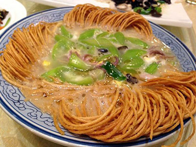 丝瓜茶馓 主料丝瓜是田间地头的寻常之物,却性味甘凉,富有清热消暑、化痰生津、利尿消肿、通经活血与通乳汁等多重功效,可以作为治疗咽喉肿痛、口舌干涩、小便短赤、产妇乳汁不通等。《本草纲目》记载:“油馓之甘味为咸,通便润肠,乃有温中益气之效”。在清香馥郁的丝瓜汤中放入酥脆清香的茶馓,细如金丝的茶馓吸饱了汤汁,变得松软适口,能生津开胃,舒筋活血,通乳散结。相传丝瓜茶饊曾治愈了慈禧太后的乳房病,现在的丝瓜茶馓仍然是产妇们月子餐里的大爱之选。