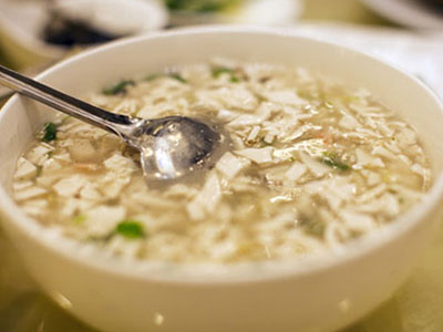 平桥豆腐 豆腐性凉,味甘。能够益气宽中,生津润燥,清热解毒,和脾胃。《食物本草》:“凡人初到地方,水土不服,先食豆腐,则渐渐调妥。”葱、姜、黑胡椒性辛热,既可以中和豆腐的凉性,又能祛豆腥、解油腻、增食欲、助消化。去性存用之后,整个菜品口感滑嫩舒爽,清淡平和,有营养易消化,除嘌呤代谢失常的疾病如痛风和血尿酸增高的患者以外,适合男女老幼食用。如果你旅途劳顿没有胃口,推荐你吃一碗平桥豆腐羹,那心里极是熨帖。