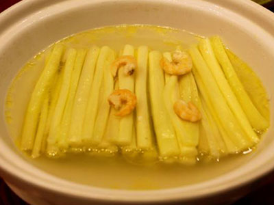 开洋蒲菜 主料蒲菜堪称真正的原生态绿色食品,它的生长环境对水质的要求很高,且人工无法种植。作为曾经救荒本草中的果腹之品,现在的蒲菜是绿水青山对人们味蕾的犒赏,它性味甘凉,归肝、肾经,有清热凉血、利水消肿的功效。开洋蒲菜口感嫩滑清香,易于消化,不仅能让健康人一饱口福,也适合病后体虚及亚健康状态的人食用,久食还有助于明目、固齿、增寿。