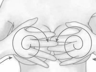 此法更适合于女性。用双手掌互相搓热后,以乳中穴为中心,按顺时针和逆时针各旋转按揉乳房36次。