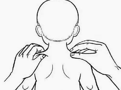 双掌搓热,纵向搓揉颈部背侧36次,再用双手中指点揉风池穴数次;横向搓揉颈部两侧36次并用中指按揉扶突或阿是穴数次;双手同时或交替,用食、中、无名三指搓擦大椎穴和大杼穴数次;用左手搓擦右侧颈根部,以肩井穴为主,然后用右手搓擦左侧,各36次。
