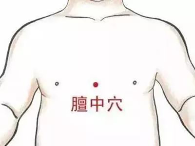 膻中穴,是养生保健中常用的一个重要穴位,位于胸部前正中线上,两乳头连线的中点,有调理脏腑、理气活血功效,主治病症为胸部憋闷不适、心悸气短不安等。但既往患有心脑血管疾病或年老体弱者,若有不适,应到医院就诊,在医生指导下治疗。