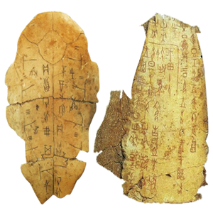 早在夏代,人们就把龟作为灵物。《左传·哀公十八年》引《夏书》曰:“官占,惟能蔽志,昆命于元龟。”《尚书·禹贡》曰:“九江纳赐大龟。”这些资料表眀夏代已用龟甲占卜了,但从二里头遗址发现的龟甲一般未经整治,有灼无钻。到殷商时期,人们则从龟腹甲整治凿孔,以火灼裂,视其裂纹,占卜吉凶,谓之龟卜。然后在龟甲上契刻卜辞和少量记事文字,这种文字就是甲骨文。在甲骨文中有不少卜辞提及了龟,如:“贞,龟不其南致”“贞,僭不其致龟”“丙午卜,其用龟” “唯龟至,有大雨”“癸亥卜,狄贞,唯龟至,王受佑”(摘自郭沫若《甲骨文合集》,编号分别为8994、8998、17666、30025、30885)