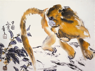 此《狨》图提款“中国之贵”,依北宋宋祁诗句“体被金毳,皮以藉焉,中国之贵”,以为诫语。图中川金丝猴踞中,金毳煌煌。旁置枫枝。影射封侯(枫猴)而灭绝了“中国之贵”。