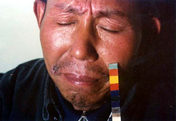 客色赤的形象为:满面通红,浮露而散,明亮润泽。(左颧白色是反射强光之故)