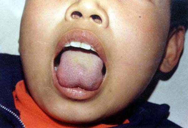 下颏、口角青黑,舌上红点的形象为:面色沉浊,准头明润,两颧略红,面颊青黑,口周下颏尤甚。唇舌暗红,舌生红点,略带青紫,苔白腻微黄。