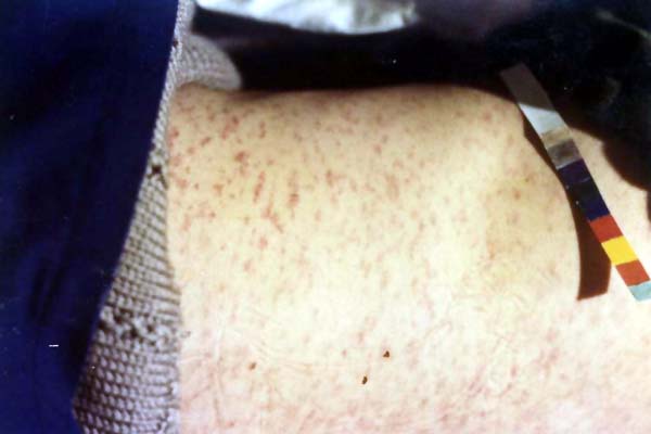 麻疹胸的形象为:躯干红疹稀疏。