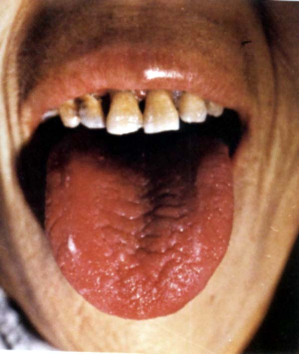 【形象】舌色绛,有红点,中部许多横褶,体胖嫩。无苔而干。