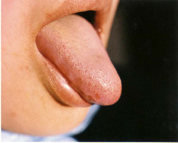 【形象】舌边尖红,有一2×2mm之红色疮疡,痛甚。苔薄白,右侧淡黄。