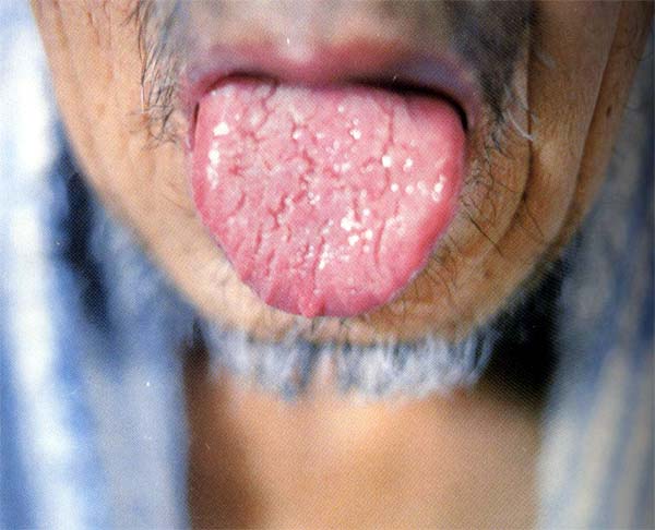 【形象】舌淡紫瘦薄,有人、爻字小裂纹。苔白浮张,淡白湿亮,呈半透明状。