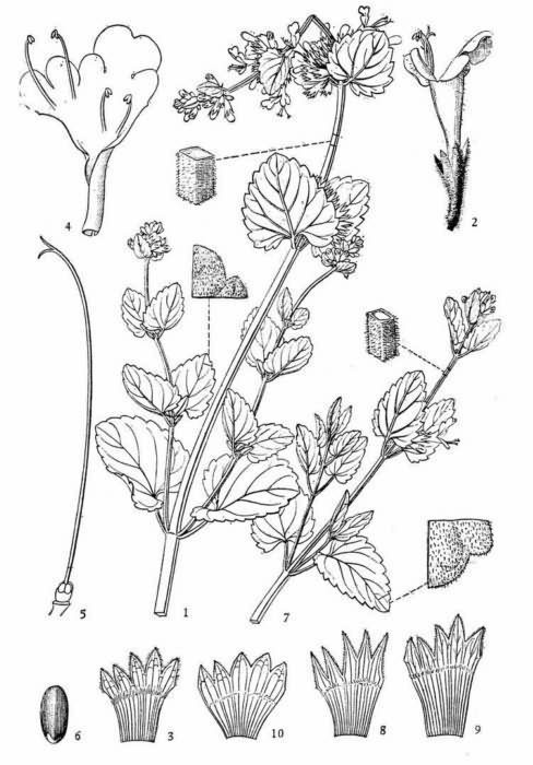 【原形态】阿尔泰扭藿香,多年生草本,高20-30cm。茎多数,直立或上升,分枝或不分枝,茎、枝均四棱形,被微柔毛及腺毛。叶对生;叶柄短,大多数不超过1cm,在上部的近无柄;叶片卵圆形或卵状心形,稀1-2.5cm,宽0.8-2(-3)cm,先端钝或急尖,基部多数心形,稀近截形或圆形,边缘具圆齿,两面密被短柔毛及腺点,网脉在下面凸起。聚伞花序腋生,总梗极短,长5mm至近无柄苞片小,线状披针形,被短柔毛;花萼管状钟形或近管形,长8-9mm,具12-15脉,外密被短柔毛及腺点,内面在喉部具毛环,萼齿5,二唇形,齿狭卵圆形或长圆状卵圆形,上唇3齿较高;花冠蓝色,长16-18mm,外被短柔毛,冠筒外伸,向上扩大,冠檐二唇形,上唇3裂,中裂片较大,先端微凹或浅2裂,侧裂阔椭圆形,下唇2深裂,裂片近圆形;雄蕊4,仅前对外伸;花柱外伸,先端2裂,裂片近相等。小坚果长圆状椭圆形,长约2mm,暗褐色。花期6-8月。