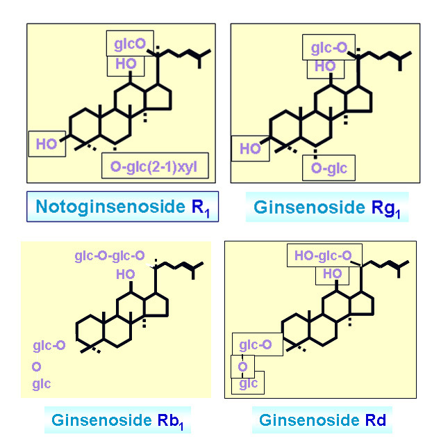皂苷(saponins)是三七主要有效活性成分,也是目前研究较为系统的化学物质,是人参属植物中广泛存在的活性物质。20世纪30年代,我国学者开始对三七皂苷进行研究,限于当时研究条件的制约,研究进展缓慢,70年代以后,随着现代分离手段及测试仪器的广泛应用,三七皂苷类化学成分的研究才取得显著的进展。迄今共分得70多种单体皂苷,其中最多的是Rg1、Rb1、R1、Rd四种单体皂苷。三七的不同部位,所含的三七皂苷成分各不相同,地下部分以人参三醇型皂苷为主,地上部分仅含人参二醇型皂苷。