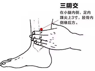 三阴交:位于内踝上3寸,胫骨内侧后缘。有益精、生津、补血、调脾胃、调冲任、强健脾胃、引火下行之功效。适用于女科疾患,如痛经、月经不调等。