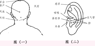 有效穴位:百会、脑户、风府、风池、天柱等穴,及支气管、肺、外鼻、感冒、咽喉、鼻眼净等耳穴(如图一)。