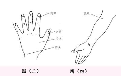 有效穴位:合谷、孔最、少商、阳溪、商阳等穴(如图三、图四、图五和图六)。