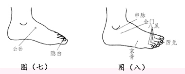 有效穴位:金门、申脉、京骨、公孙、隐白、厉兑等穴位(图七、图八和图九)。