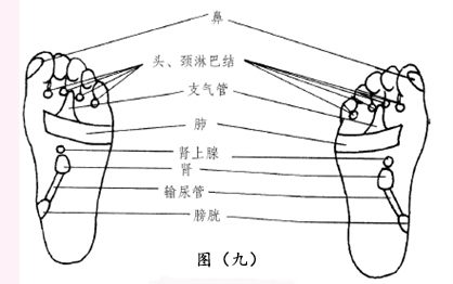 按摩手法:①依次点按足部肾和肾上腺反射区各50~100次,向足跟方向点按, 以微微酸痛为宜,每日2次。②推按足部输尿管反射区30~50次,由足趾向足跟推按,用力要均匀,力量不要太大,以自觉酸胀为佳。③点按足部膀胱、鼻反射区各50~100次。④由足外侧向足内侧推按肺、支气管反射区各50~100次。