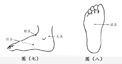 按摩手法 单指扣拳,点按涌泉、解溪、然谷、太溪等穴,各50~100次,力度适中。
