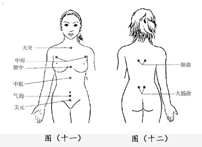 有效穴位 天突、膻中、中府、中脘、气海、关元、肺俞、大肠俞等穴位(图十一、图十二)。