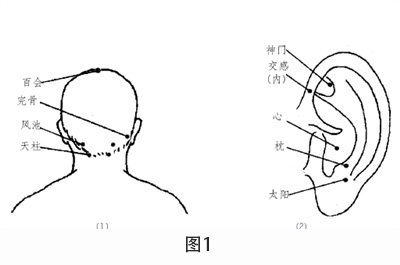 有效穴位 百会、风池、天柱、完骨等,及神门、交感、枕、心、太阳等耳穴(如图1)。