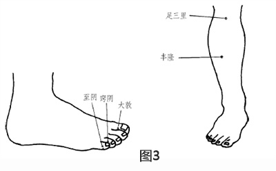 按摩手法 ①大敦、窍阴、至阴穴各掐按5~10次,力度适中。②足三里、丰隆穴各按揉10~30次。
