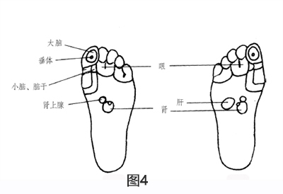 足部有效反射区 垂体、大脑、眼、肝、肾、肾上腺等(如图4)