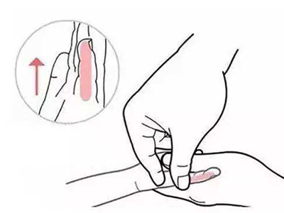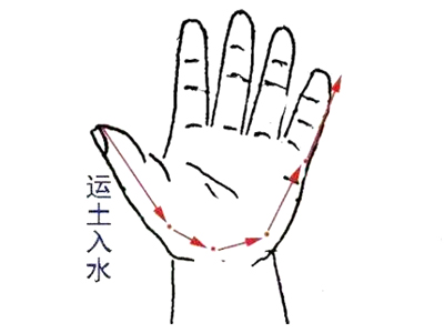 运土入水:拇指指尖桡侧缘运起经小天心、掌小横纹到小指尺侧缘处5~10分钟。