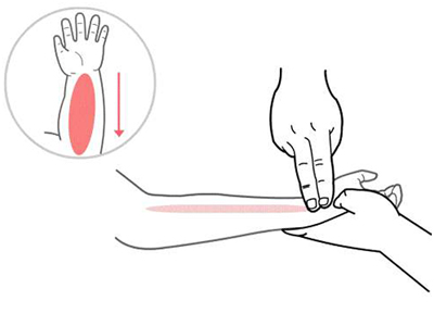 清天河水:前臂掌侧正中,腕横纹至肘横纹成一直线,自腕横纹直推至肘横纹360次。