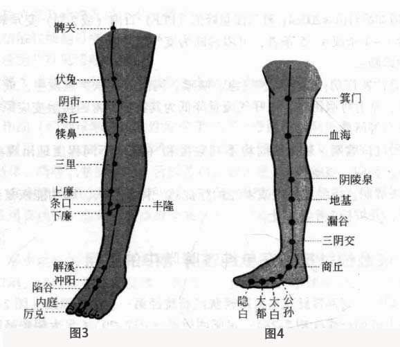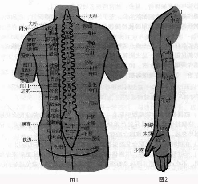 叩剌部位:背部督脉及足太阳膀胱经膀胱经第一、第二侧线(图1);手太阴肺经上肢循行线(图2);足阳明胃经(图3)、足太阴脾经膝以下循行线(图4);肺俞、定喘、膻中、中脘、气海、足三里。
