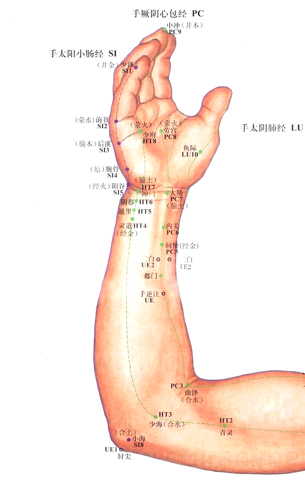 【定位】握拳第五指掌关节前尺侧,横纹头赤白肉际。
