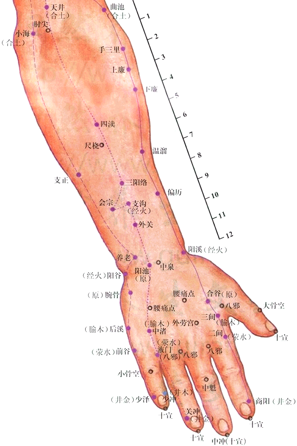 【定位】在小指末节桡侧,距指甲角0.1寸。