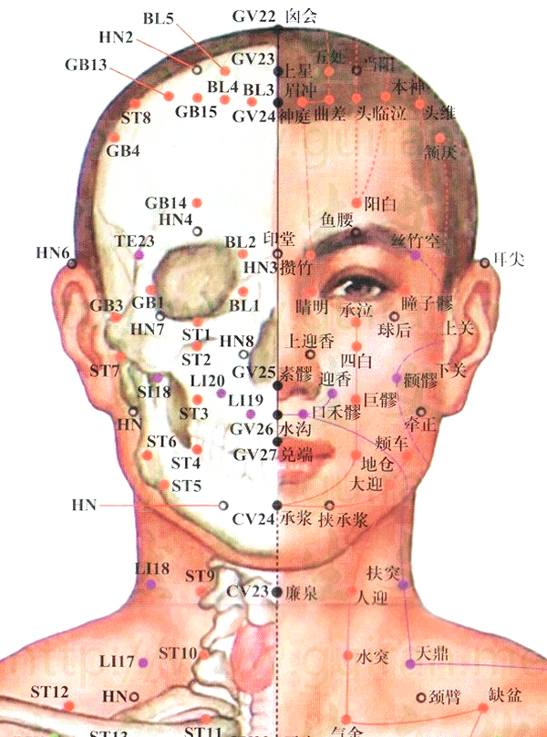 【定位】在头部,当前发际正中直上0.5寸,旁开1.5寸。神庭穴(督脉) 旁1.5寸,当神庭穴与头维穴连线的内1/3与中2/3交点。