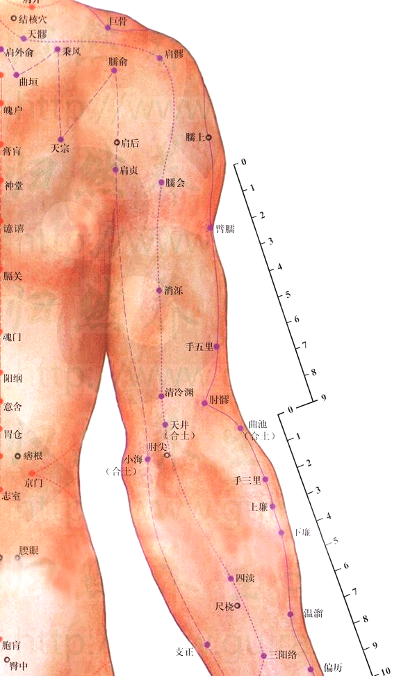 【定位】在臂外侧,屈肘时,当肘尖直上2寸,即天井上1寸。