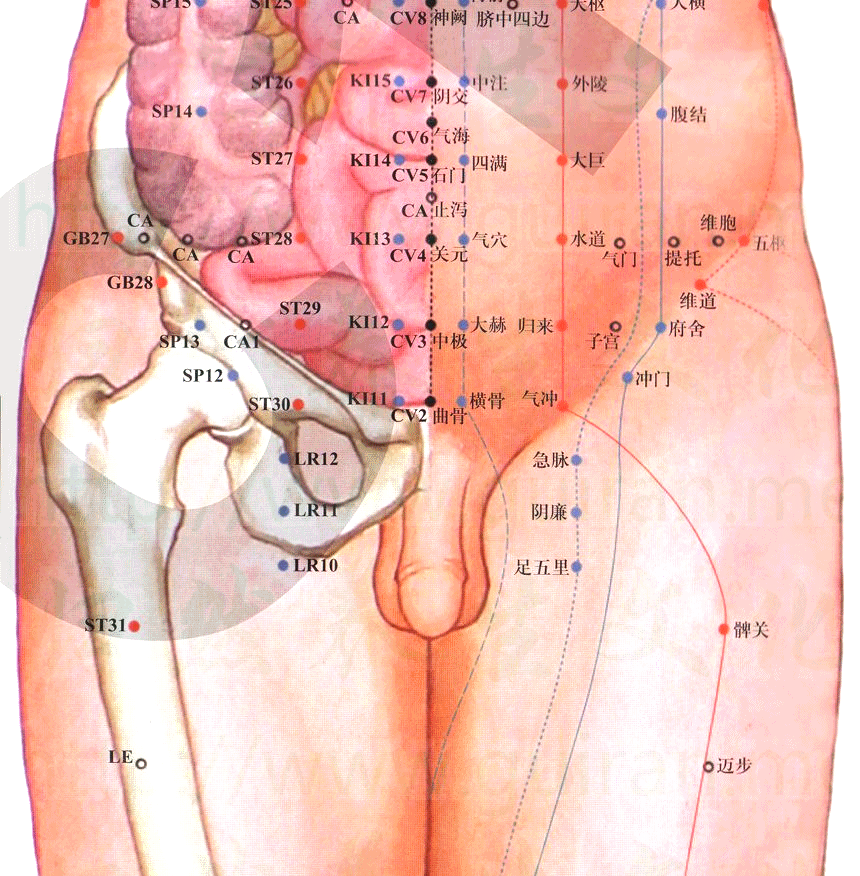【定位】在大腿内侧,曲骨穴旁开2寸,直下2寸。
