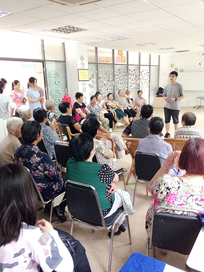 志愿者分为表演组、义诊组与宣讲组,同时开设兴趣班。表演组的同学轮流演唱了《同桌的你》、《小手拉大手》和《游击队之歌》,获得爷爷奶奶一致好评,还激起了爷爷奶奶的演唱热情,轮番上台一展歌喉。