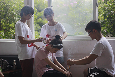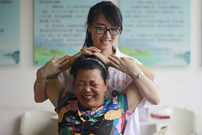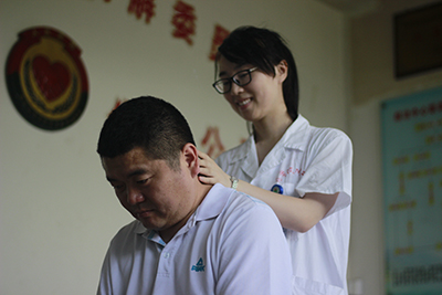 刚布置好场地,实践队员就迎来了第一批“顾客”。“平时锻炼的机会不多,又因工作需要,一天到晚坐在电脑前,所以常常感到腰背很酸。”一位阿姨求助道。“对准第7颈椎棘突下凹陷处,将中、食二指分开,置于施灸部位的两侧,用点燃的艾条熏烤,至皮肤红晕为度。”随队的中医康复医生听完受诊者的基本描述后,便开始仔细查诊,并经过规范训练的队员对指定的穴位进行艾灸。楼里的办事员陆续闻讯而来,实践队员们则有条不紊地开展艾灸、推拿等中医康复法,更有医生为他们拔火罐、施针灸。结束时,中医康复专业医生还为他们提供了以疗程为单位的康复建议。