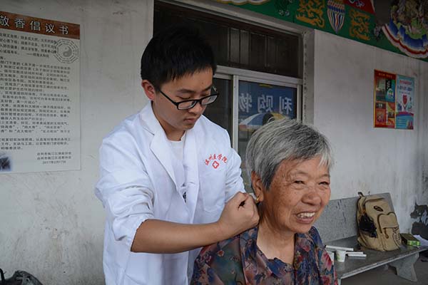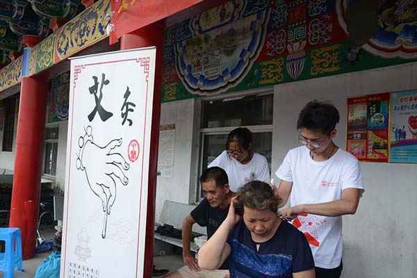 “你们是不是每年都来啊?”一位卖菜的老农边做着艾灸,边跟队员们聊起了天。据悉,这也是实践队第四年开展国医养生体验馆,通过体验式服务将专业技能与志愿服务结合起来,在传承经典中医技法的同时,为发扬中医养生知识献力。