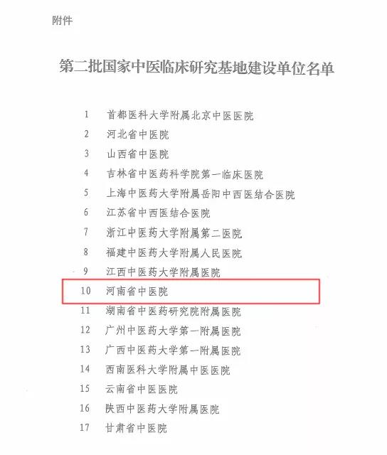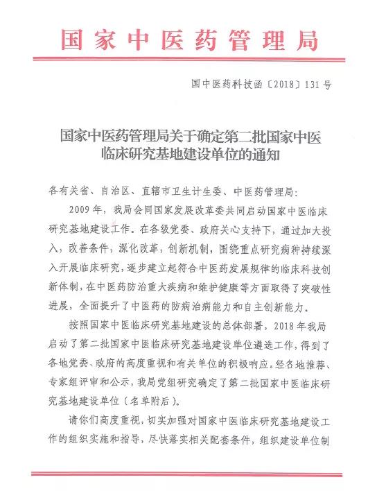 近日,根据国中医药科技函〔2018〕131号《国家中医药管理局关于确定第二批国家中医临床研究基地建设单位的通知》,河南省中医院被确定为第二批国家中医临床研究基地建设单位。