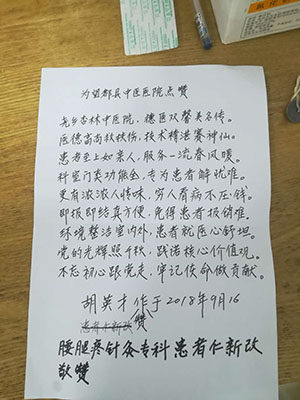 近日,望都县中医医院腰腿痛针灸科病区收到一封感谢信,字里行间不仅透露出患者对中医诊疗技术的肯定和对医护人员服务质量的满意,更表达出对望都县中医医院精细化管理、人性化服务的称赞。