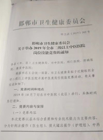 邯郸市馆陶县中医院选派的李茂林、武春静、郑兰3位选手,分别参加了中医中药类临床医疗组的毫针针刺、护理组的拔罐、中药鉴别组的中药鉴别3个比赛项目的技能比赛。
