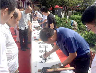 图为河南省南阳市医圣祠现场,书法家现场书写中医药书法作品。