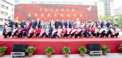 会议由中国中医科学院党委书记查德忠主持,中国中医科学院援鄂抗疫一线人员、院直机关全体人员等参加报告会。会上为中国中医科学院援鄂抗疫人员颁发了纪念奖章,向中国国家博物馆捐赠了抗疫请战书及有关物品。